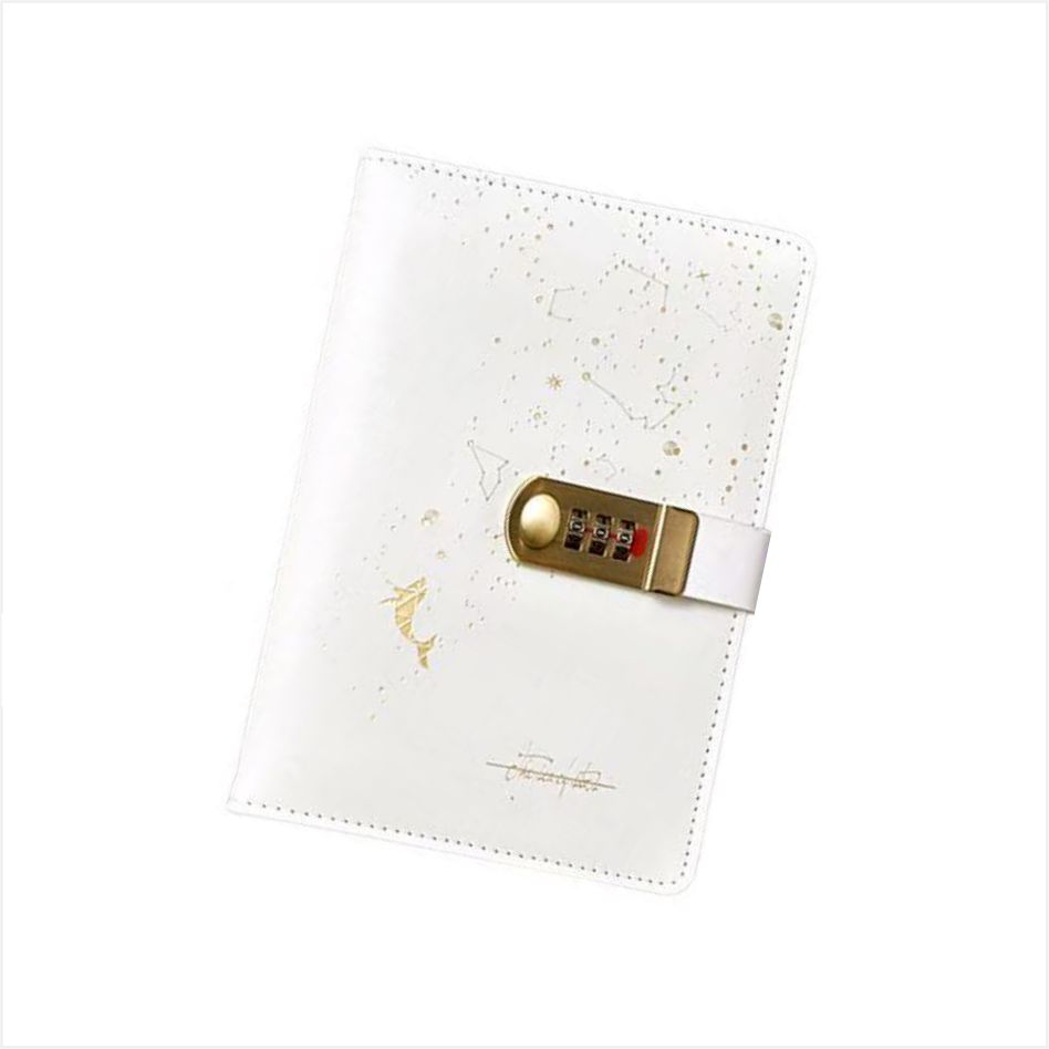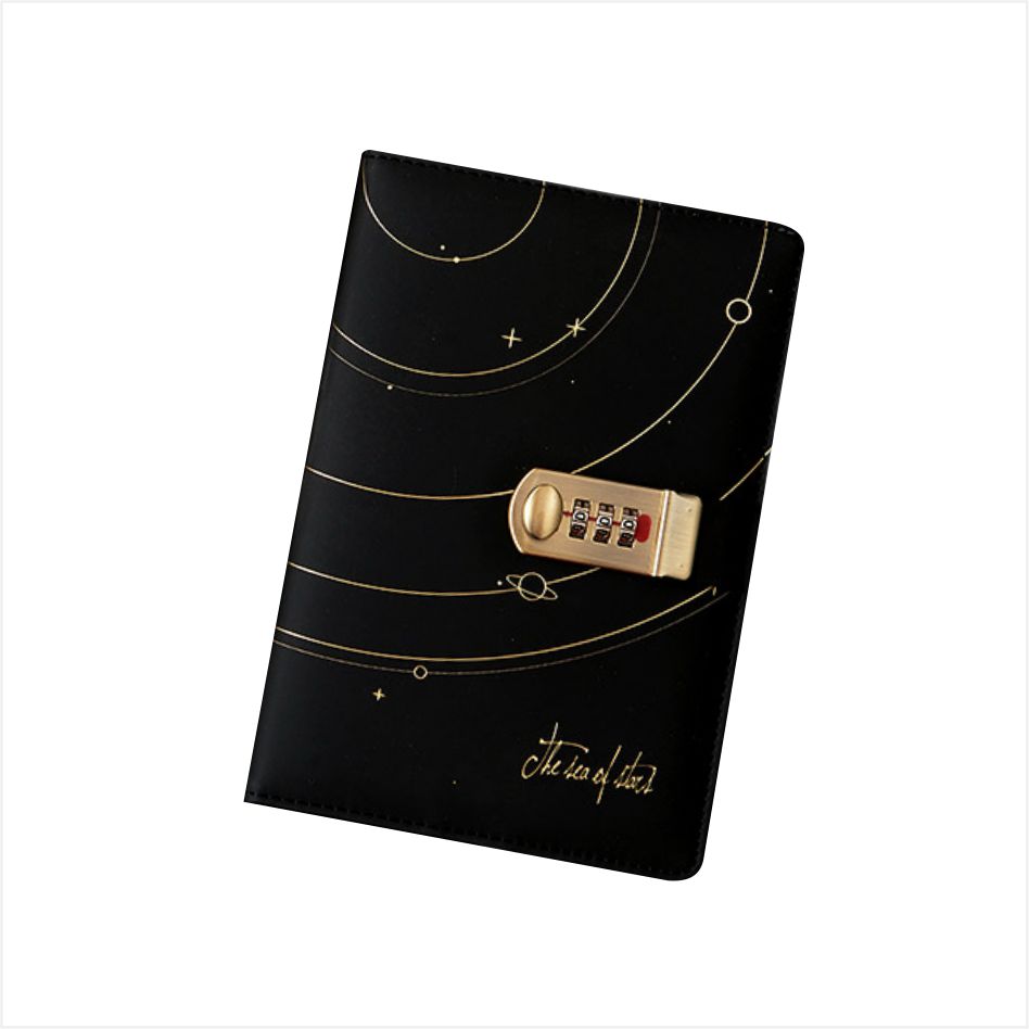 Kulit buku harian dengan kunci ini diperbuat daripada teknologi bersalut emas yang indah, yang menggariskan trajektori yang serupa dengan orbit planet dengan garisan ringkas, dihiasi dengan titik-titik kecil seperti bintang, seolah-olah memekatkan langit malam yang misteri menjadi gambar, tenang dan penuh dengan khayalan. Ia dilengkapi dengan kunci gabungan logam emas, yang dikawal oleh kata laluan tiga digit. Anda boleh menetapkan kata laluan anda sendiri untuk memastikan hanya anda yang boleh membuka kandungan.